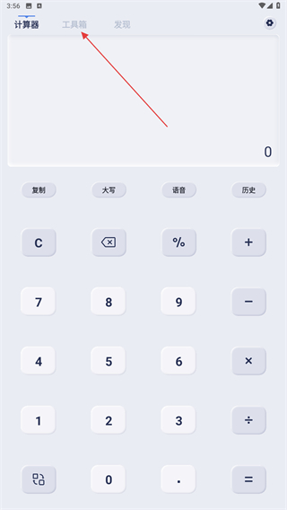 1、打開計算器APP,進入到首頁內(nèi)點擊上方工具箱的標簽。
