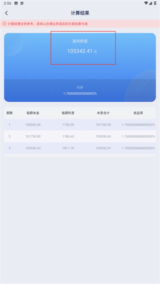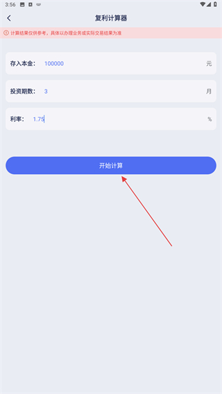 3、進入復(fù)利計算器的界面內(nèi),輸入存入本金、投資期數(shù)、利率,再點擊開始計算的按鈕。