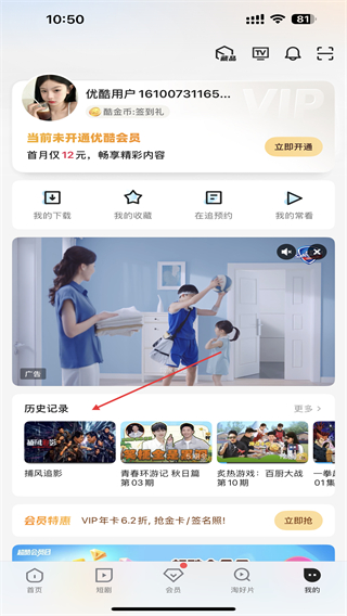 2、進入我的頁面內,點擊下方歷史記錄的按鈕。