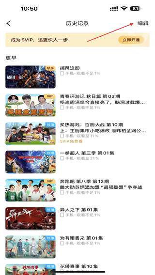 3、進入歷史記錄的界面內,點擊右上角編輯的按鈕。