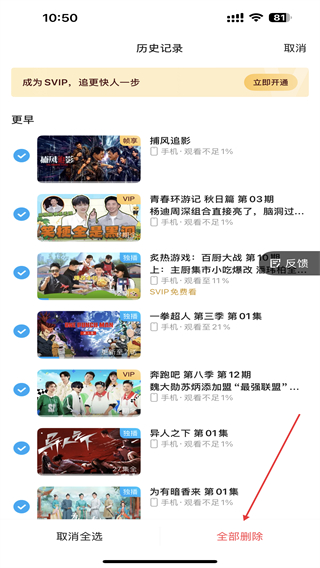 4、勾選要刪除的視頻內容后,點擊右下角刪除按鈕。