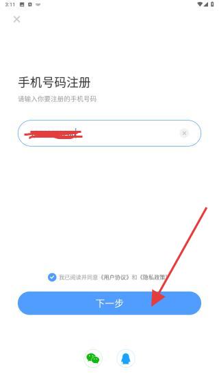 3、進入注冊的界面內(nèi),輸入要注冊的手機號后,點擊下一步的按鈕。