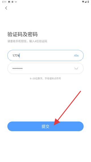 4、將收到的驗證碼、密碼輸入進去后,點擊提交的按鈕即可完成注冊。