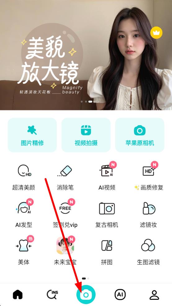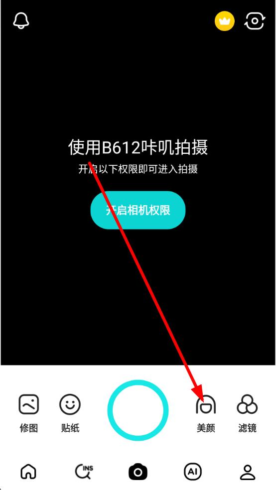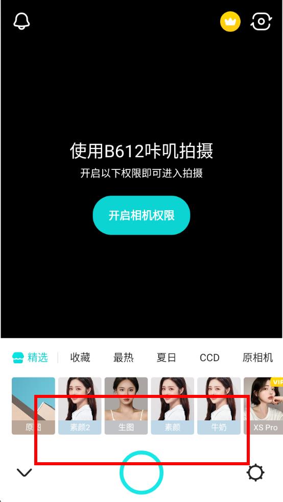 1、打開(kāi)B612咔嘰,點(diǎn)擊底部相機(jī)圖標(biāo),進(jìn)入拍攝界面,若提示開(kāi)啟權(quán)限,點(diǎn)擊開(kāi)啟相機(jī)權(quán)限完成授權(quán)。