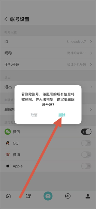 4、在彈出的確認(rèn)提示框中,點(diǎn)擊刪除,按提示操作完成賬號(hào)信息刪除,可能會(huì)收到自動(dòng)退出的提示,點(diǎn)擊確定即可。