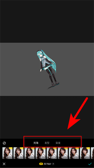 3、在AI發(fā)型編輯頁(yè)面,選擇劉海、發(fā)型、染發(fā)等分類,挑選喜歡的發(fā)型樣式。