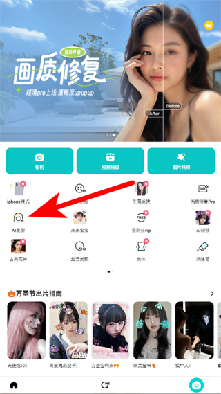 1、打開(kāi)b612咔嘰APP,點(diǎn)擊AI發(fā)型功能入口,進(jìn)入功能選擇頁(yè)面。