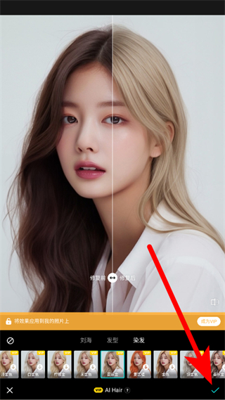 4、選擇好發(fā)型后,點(diǎn)擊右下角確認(rèn)按鈕,即可將所選發(fā)型效果應(yīng)用到照片上。