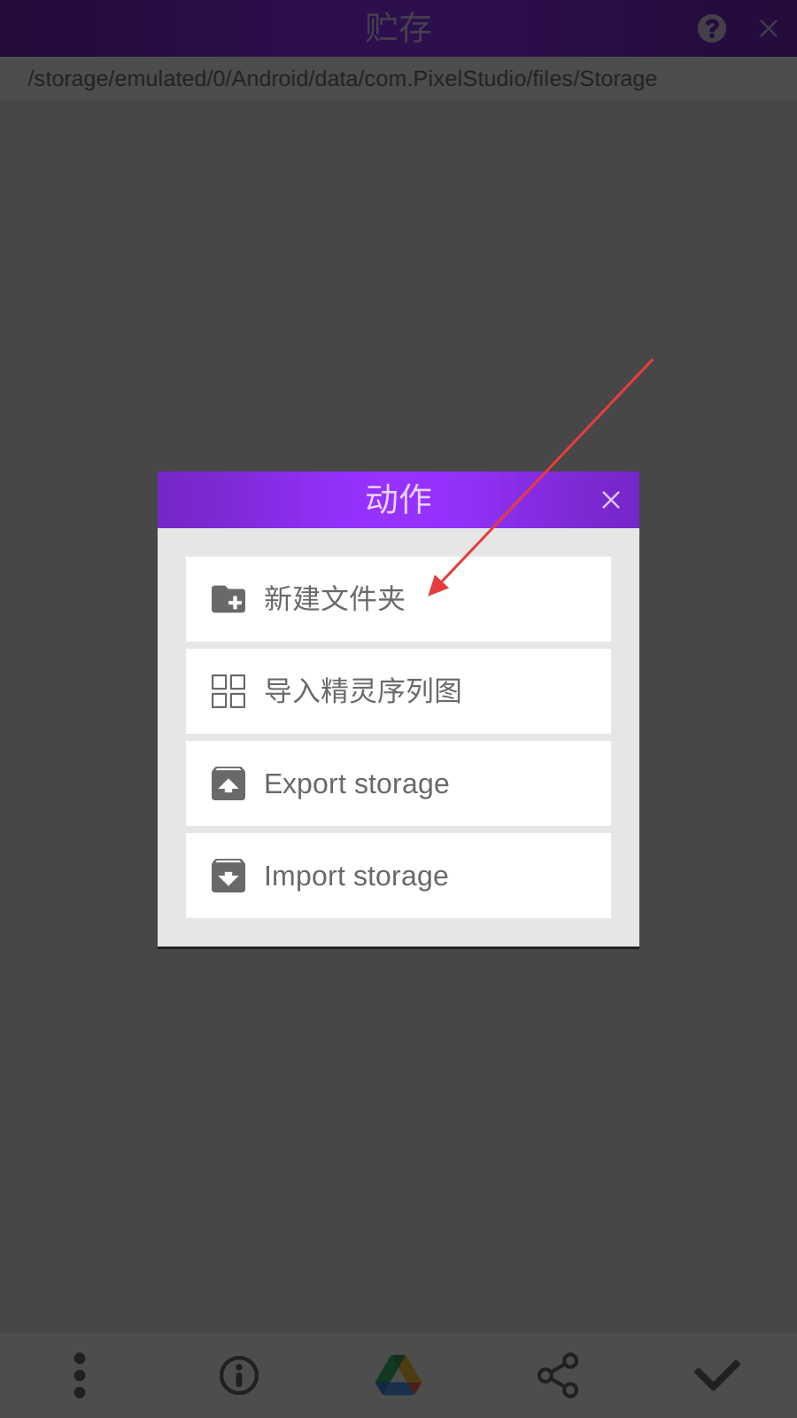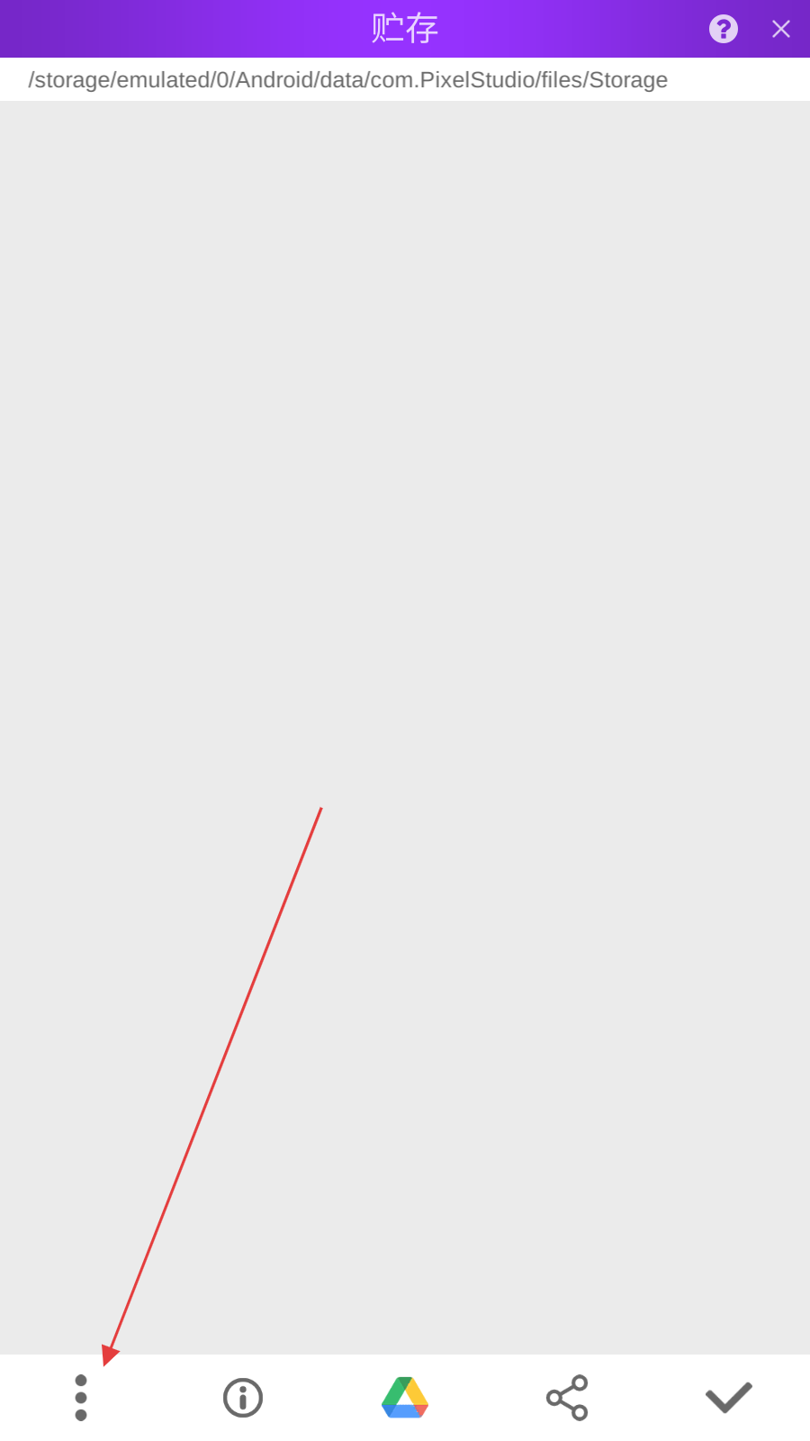 1、打開Pixel Studio應(yīng)用,進(jìn)入貯存界面,點(diǎn)擊左下角的三個(gè)點(diǎn)圖標(biāo),彈出選項(xiàng)菜單。