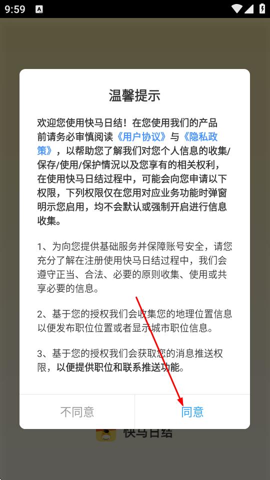 1、打開快馬日結(jié)APP,在彈出的溫馨提示頁面,點(diǎn)擊同意。