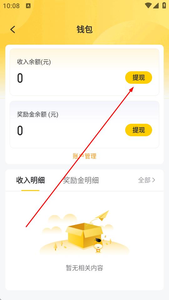 4、在錢包頁面,點(diǎn)擊收入余額右側(cè)的提現(xiàn)按鈕即可。
