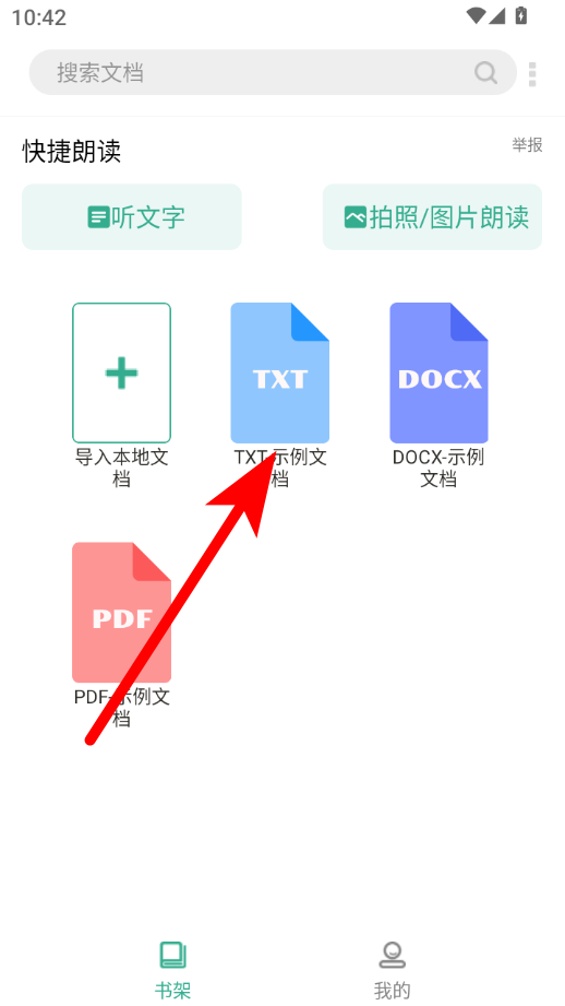 1、在開心聽書書架頁面,點(diǎn)擊TXT示例文檔,進(jìn)入聽書界面。
