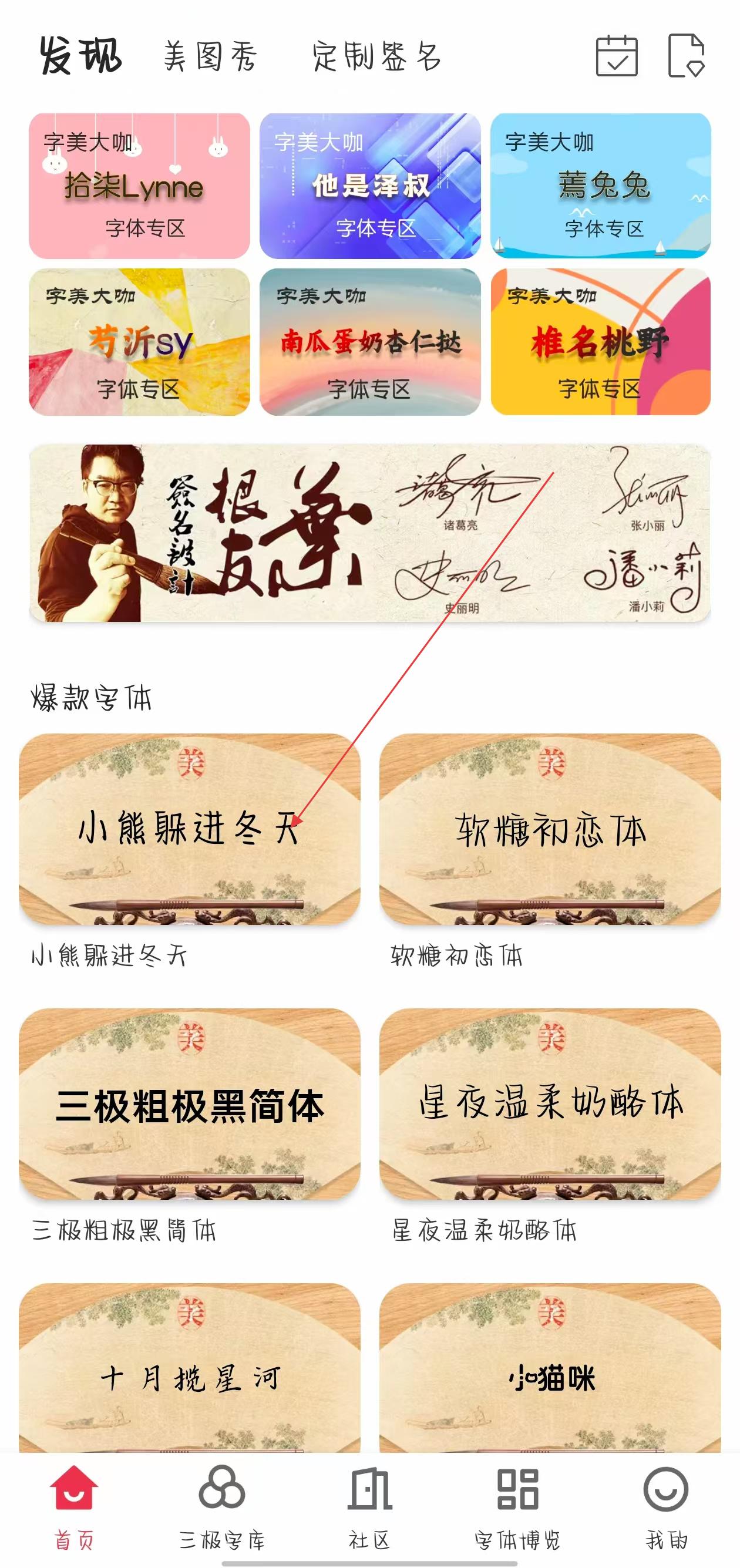 1、打開字體美化大師APP,在首頁或字體瀏覽頁面中,選擇想要導(dǎo)出的字體,比如點擊小熊躲進冬天字體。
