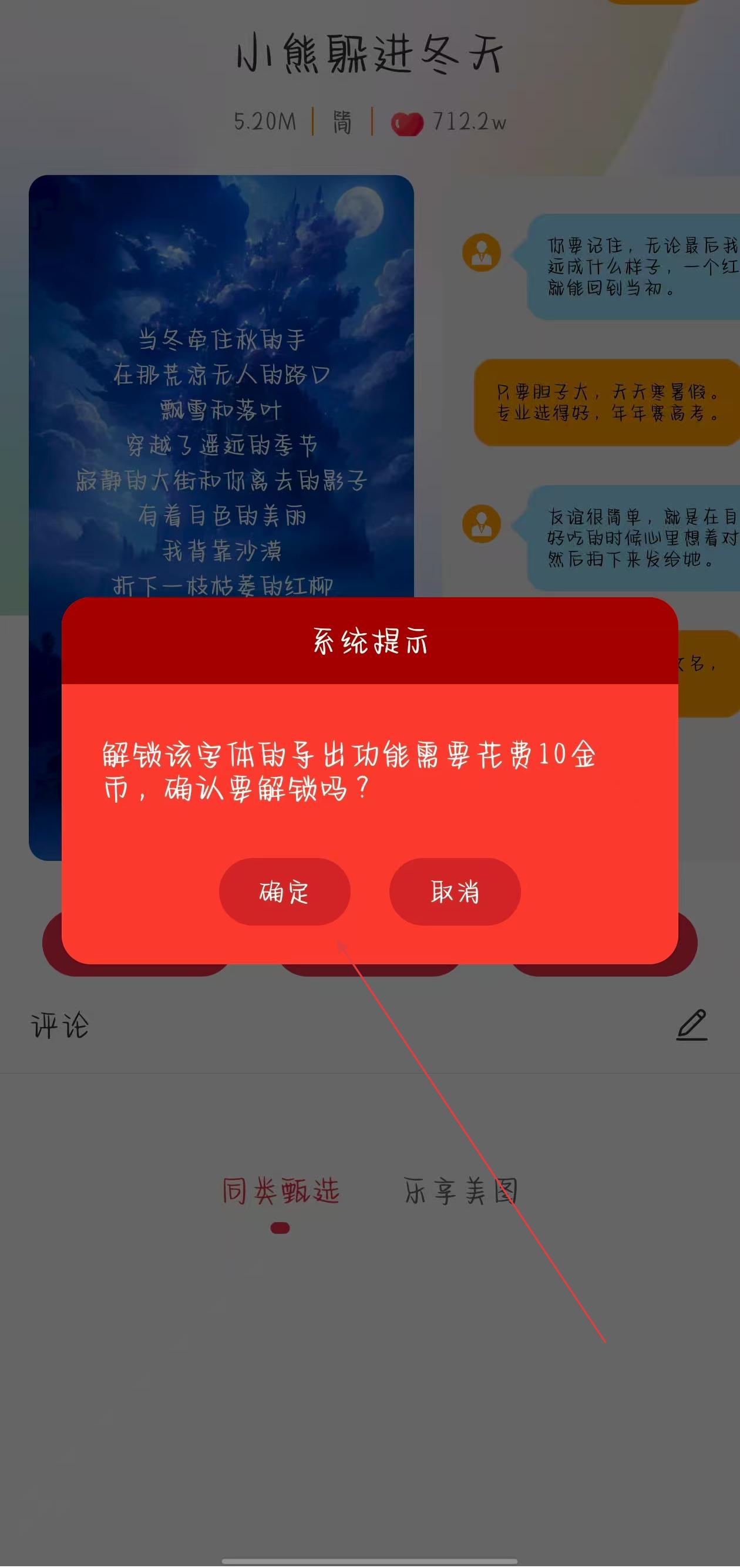 3、導(dǎo)出功能需要解鎖,會彈出系統(tǒng)提示,根據(jù)提示可能需要花費一定數(shù)量的金幣來解鎖導(dǎo)出功能,點擊確定并按照后續(xù)引導(dǎo)完成操作后,即可導(dǎo)出字體。