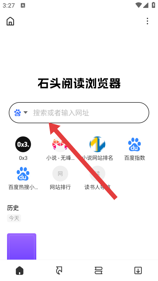 1、打開石頭閱讀瀏覽器,點(diǎn)擊搜索或者輸入網(wǎng)址欄,可搜索想要閱讀的小說。