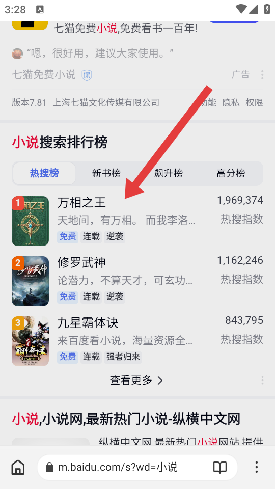 2、在小說搜索排行榜中,點(diǎn)擊目標(biāo)小說如萬相之王,進(jìn)入小說詳情頁。
