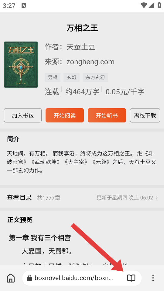 3、在小說的詳情頁,點(diǎn)擊底部書本形狀的圖標(biāo),進(jìn)入閱讀的界面。