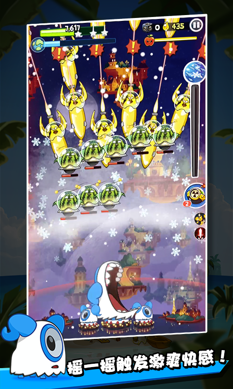 2、游戲操作很簡(jiǎn)單,點(diǎn)擊屏幕,搖一搖觸發(fā)必殺技,簡(jiǎn)單的操作就能帶來無限擊殺水果外星人的快感!