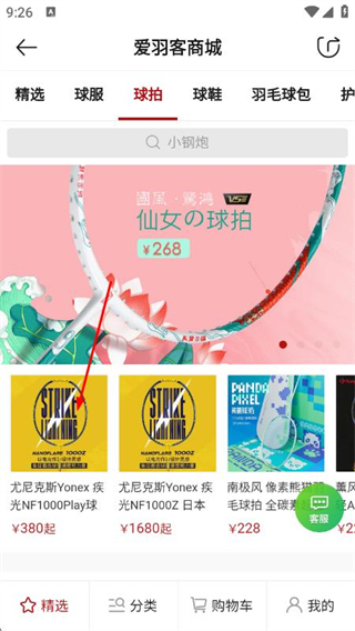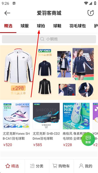 2、在愛羽客商城頁面點(diǎn)擊球拍分類。