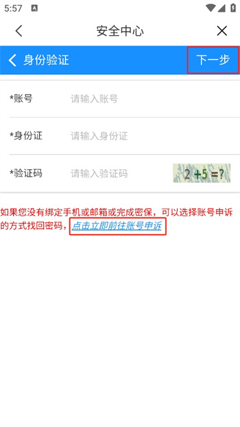 3、輸入賬號(hào)、身份證、驗(yàn)證碼點(diǎn)擊右上角【下一步】,進(jìn)入到下一步的申訴中,如果沒有綁定手機(jī)、郵箱、保密就可以點(diǎn)擊下面的【點(diǎn)擊立即前往賬號(hào)申訴】前往對(duì)應(yīng)申訴界面中;