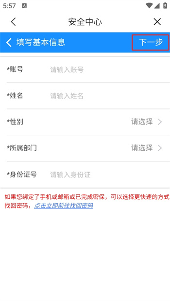 4、在這里輸入自己的賬號(hào)、姓名、性別、所屬部門、身份證號(hào)繼續(xù)點(diǎn)擊【下一步】的按鍵前往下一步的步驟之中;