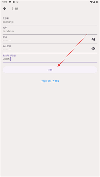 4、在注冊的界面內(nèi),輸入登錄名、昵稱、密碼以及邀請碼,再點擊注冊的按鈕即可。