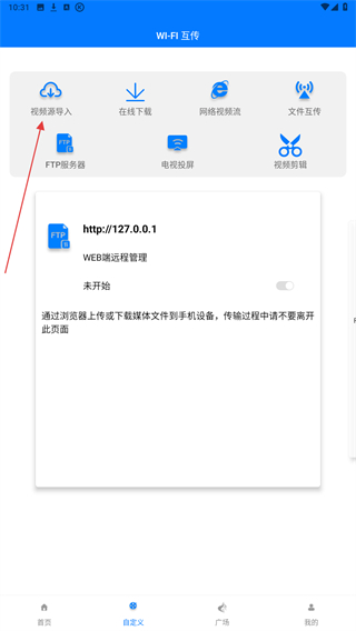2、進入Wi-Fi互傳的頁面內(nèi),點擊上方視頻源導入的功能按鈕。