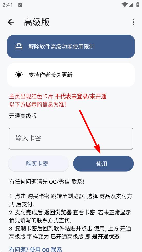 3、在高級(jí)版頁面的開通高級(jí)版區(qū)域,輸入獲取到的卡密,點(diǎn)擊使用按鈕,即可開通高級(jí)版句號(hào)。