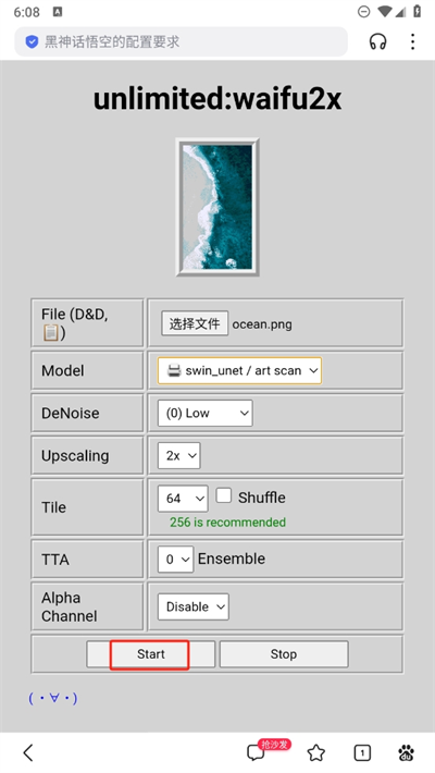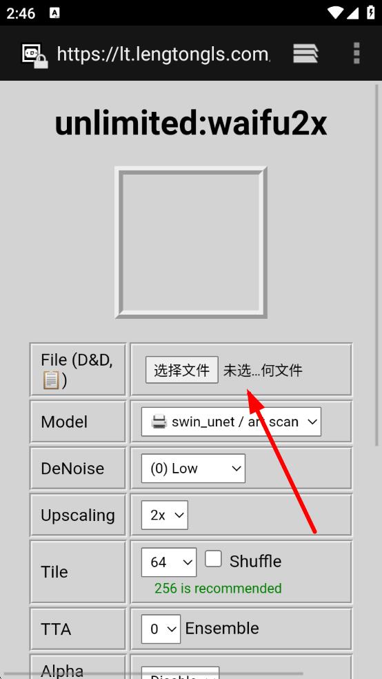 3、在瀏覽器打開(kāi)的unlimited:waifu2x頁(yè)面中,點(diǎn)擊選擇文件按鈕,按后續(xù)指引選擇需要修復(fù)的文件,并設(shè)置相關(guān)參數(shù)完成文件修復(fù)操作。