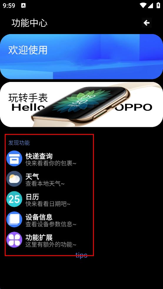 2、點(diǎn)擊功能中心,可查看發(fā)現(xiàn)功能里的快遞查詢(xún)、天氣、日歷、設(shè)備信息、功能擴(kuò)展等功能。