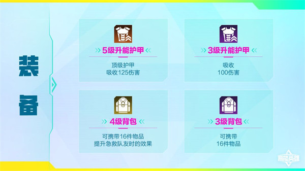 裝備:其中「5級(jí)升能護(hù)甲」為支援倉(cāng)專(zhuān)屬物品(玩家無(wú)法從地面中得到,但可以通過(guò)積累傷害和升能得到)。