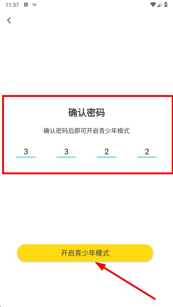 4、在確認(rèn)密碼頁(yè)面再次輸入設(shè)置的密碼,然后點(diǎn)擊開啟青少年模式按鈕,即可成功開啟。