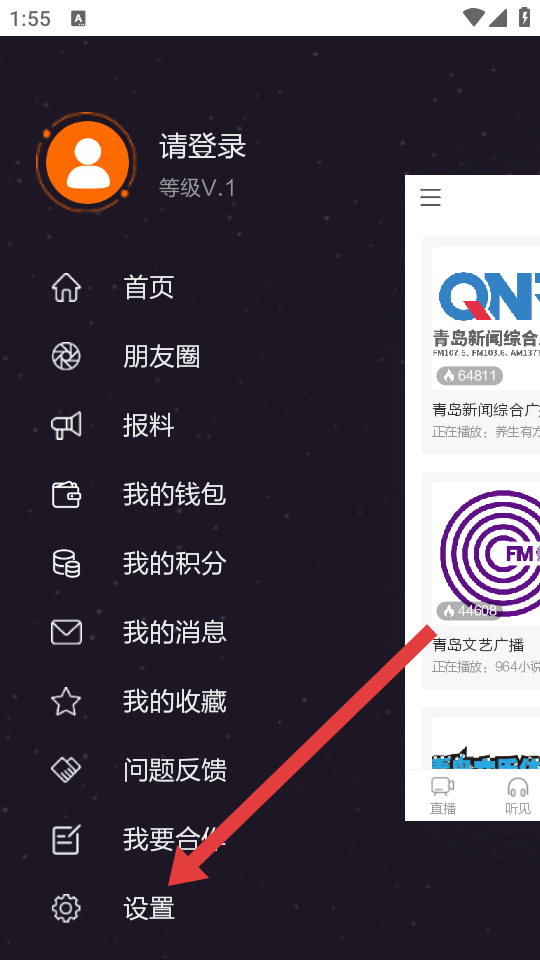 1、在電臺(tái)的界面,點(diǎn)擊左上角的三條橫線圖標(biāo),打開(kāi)側(cè)邊欄菜單。