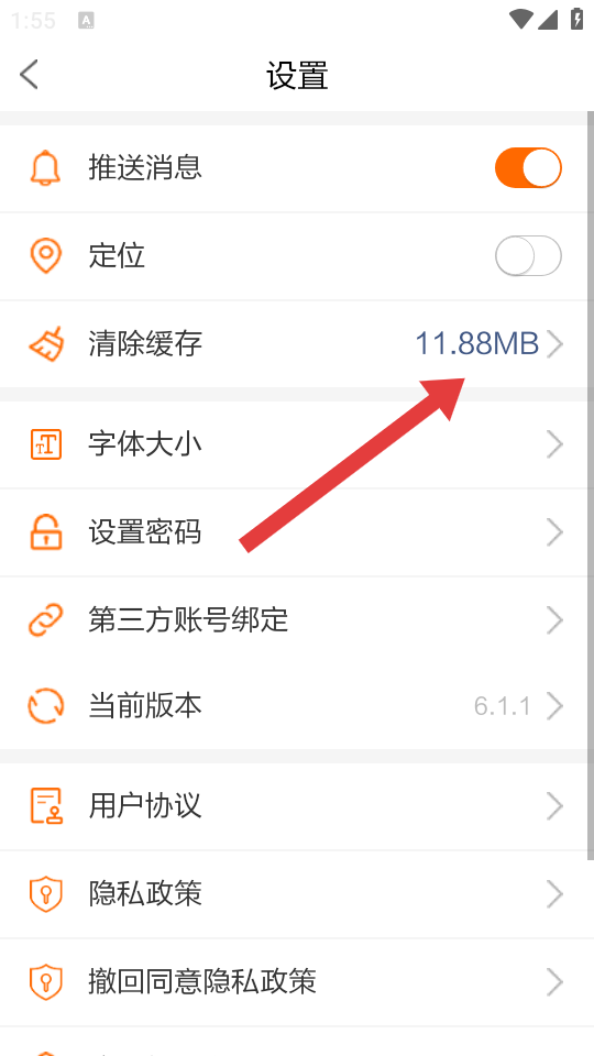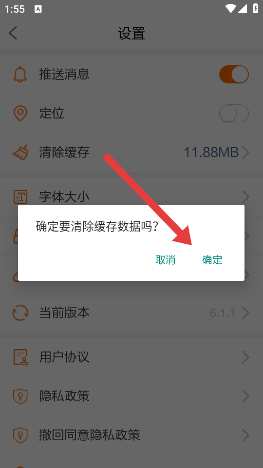 3、在設(shè)置頁(yè)面,點(diǎn)擊顯示11.88MB的清除緩存選項(xiàng),觸發(fā)緩存清除確認(rèn)框。