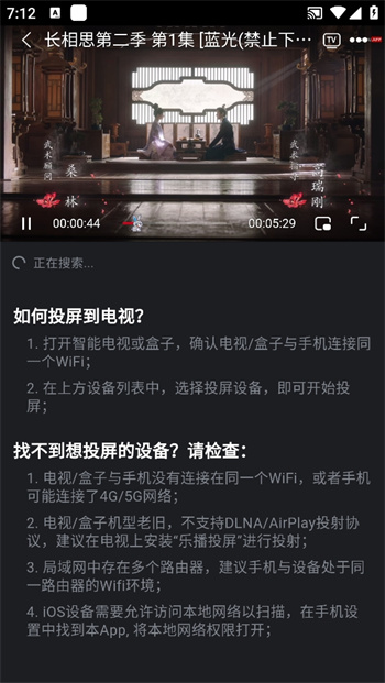 3、之后下面便開(kāi)始搜索周圍的設(shè)備,當(dāng)搜索到之后就可以進(jìn)行投屏,當(dāng)搜索不到的時(shí)候可以閱讀下方的提示,看看自己投屏所處的環(huán)境是否正確再繼續(xù)操作;