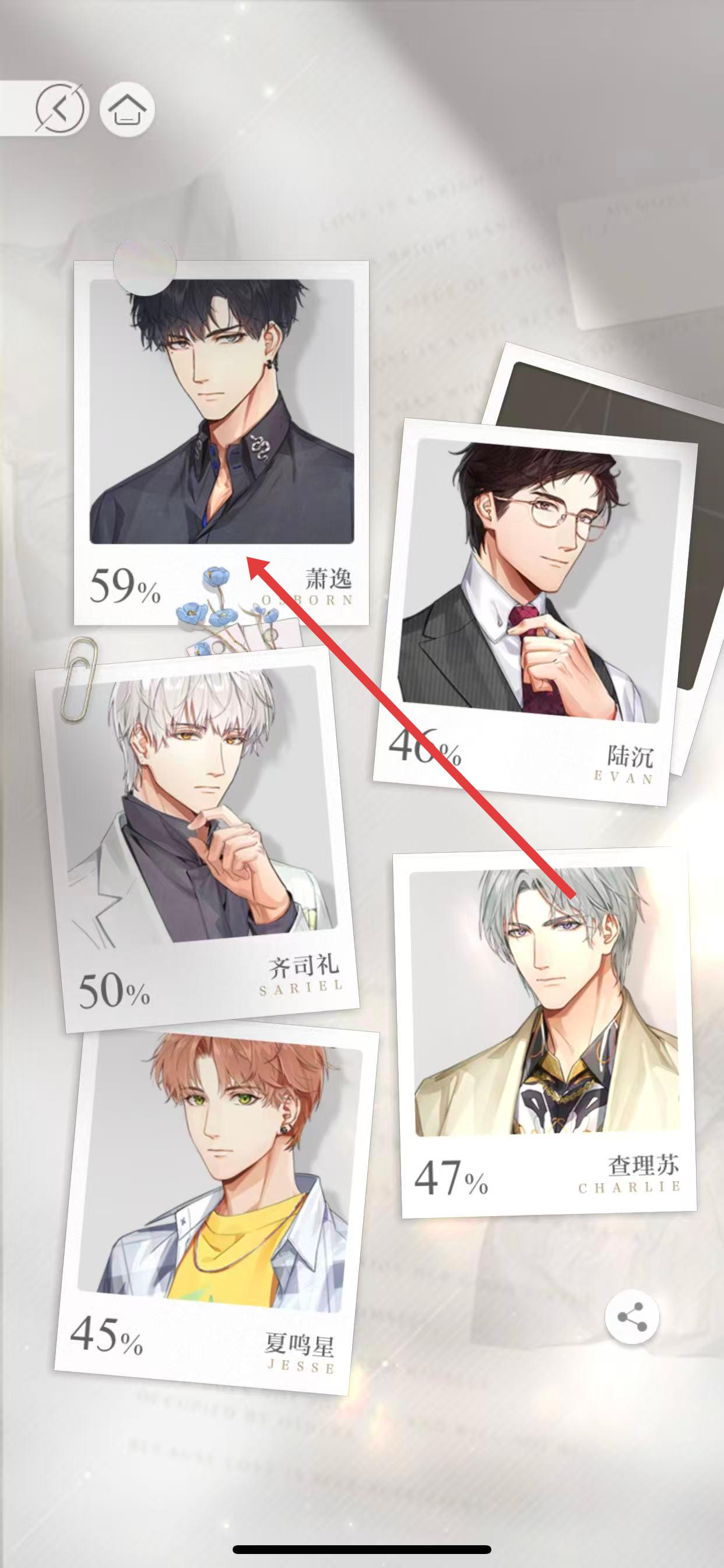 3、在靈犀相冊界面,可以看到各個男主對應(yīng)的頭像卡片,百分比數(shù)值,就是該男主的卡牌收集度。