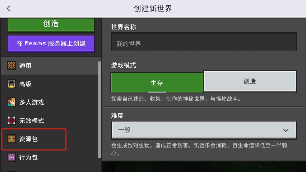 3、在這里可以選擇不同的游戲模式,同時在通用欄目中找到資源包功能;