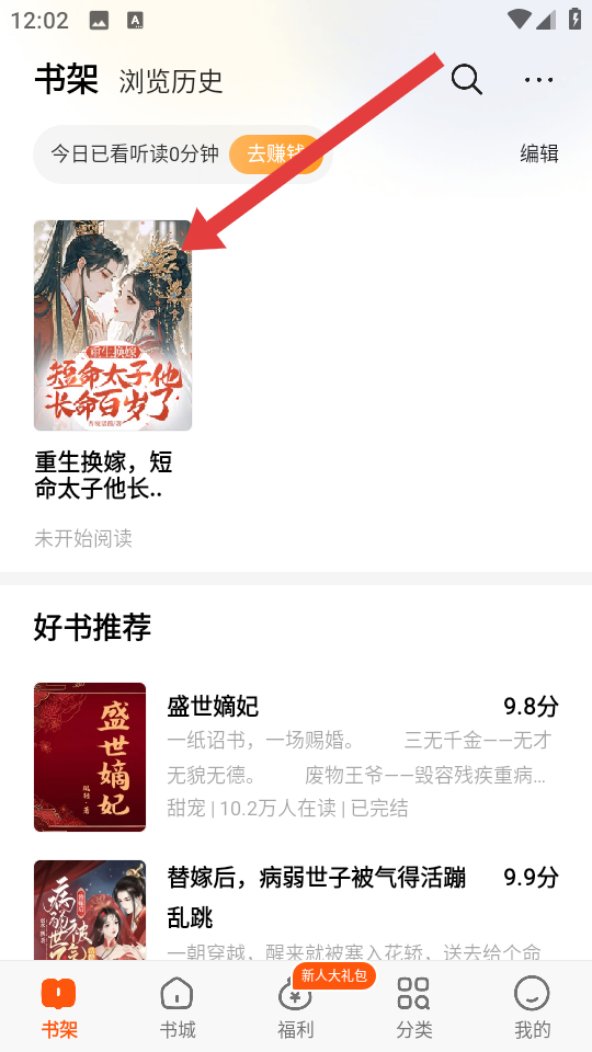 1、在七讀書架頁面,點擊要聽的小說,進入小說閱讀界面。