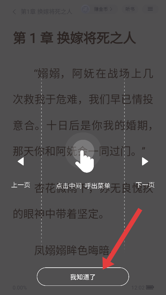 2、在小說閱讀界面,點擊我知道了按鈕,關(guān)閉點擊中間呼出菜單的提示。
