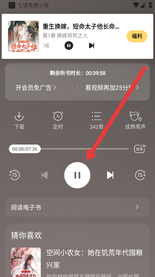 4、進入聽書界面后,點擊中間的播放/暫停按鈕,即可控制小說音頻的播放,開始聽書。