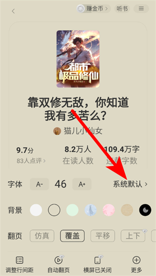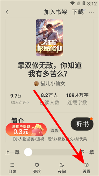 2、在小說閱讀頁面,點擊設(shè)置選項,展開設(shè)置菜單。