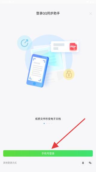 1、打開QQ同步助手APP,若為首次啟動,在歡迎頁點擊手機號登錄按鈕。