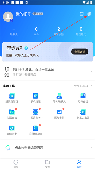 請在右下角【我的】菜單中,點擊右上角設置按鈕,點擊“設置同步內(nèi)容”進入設置,即可根據(jù)個人需求設置是否同時備份通話記錄和軟件記錄。