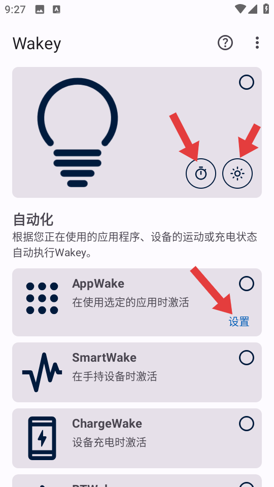 1、打開主界面,可點(diǎn)擊燈泡定時(shí)、亮度圖標(biāo)設(shè)置、AppWake右側(cè)的設(shè)置使用。