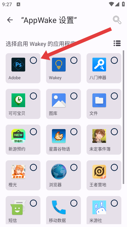 2、在AppWake設(shè)置頁面,勾選需要啟用Wakey的應(yīng)用,完成應(yīng)用級(jí)觸發(fā)配置。