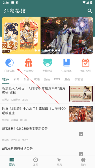 1、打開江湖茶館應(yīng)用,在首頁找到門派詳解圖標(biāo),點(diǎn)擊該圖標(biāo),進(jìn)入門派列表頁面。