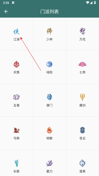 2、在門派列表頁面,可看到江湖,少林,萬花等多個門派選項,點(diǎn)擊自己要找的門派選項,進(jìn)入江湖技能詳情頁面。