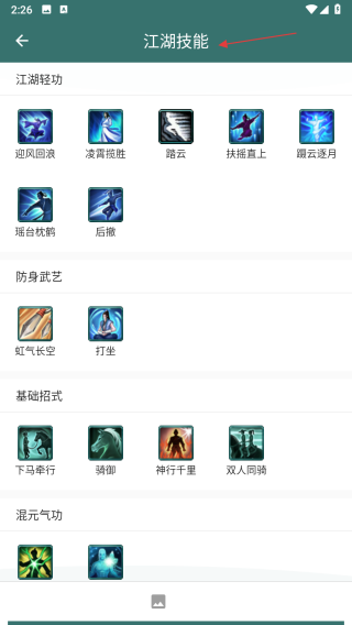 3、在江湖技能頁面,即可查看江湖輕功、防身武藝、基礎(chǔ)招式、混元?dú)夤Φ雀黝愰T派相關(guān)的技能詳解信息。