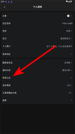 4.在個人資料界面,點(diǎn)擊機(jī)型認(rèn)證選項(xiàng),按照提示完成手機(jī)機(jī)型的認(rèn)證操作即可。