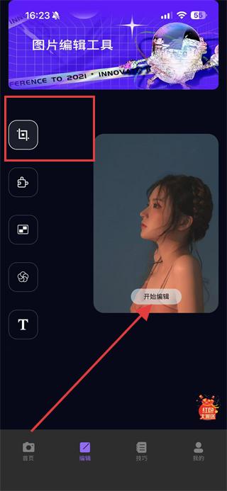 2、在圖片編輯工具頁(yè)面點(diǎn)擊裁剪圖標(biāo),再點(diǎn)擊開(kāi)始編輯,選擇要修改大小的圖片。